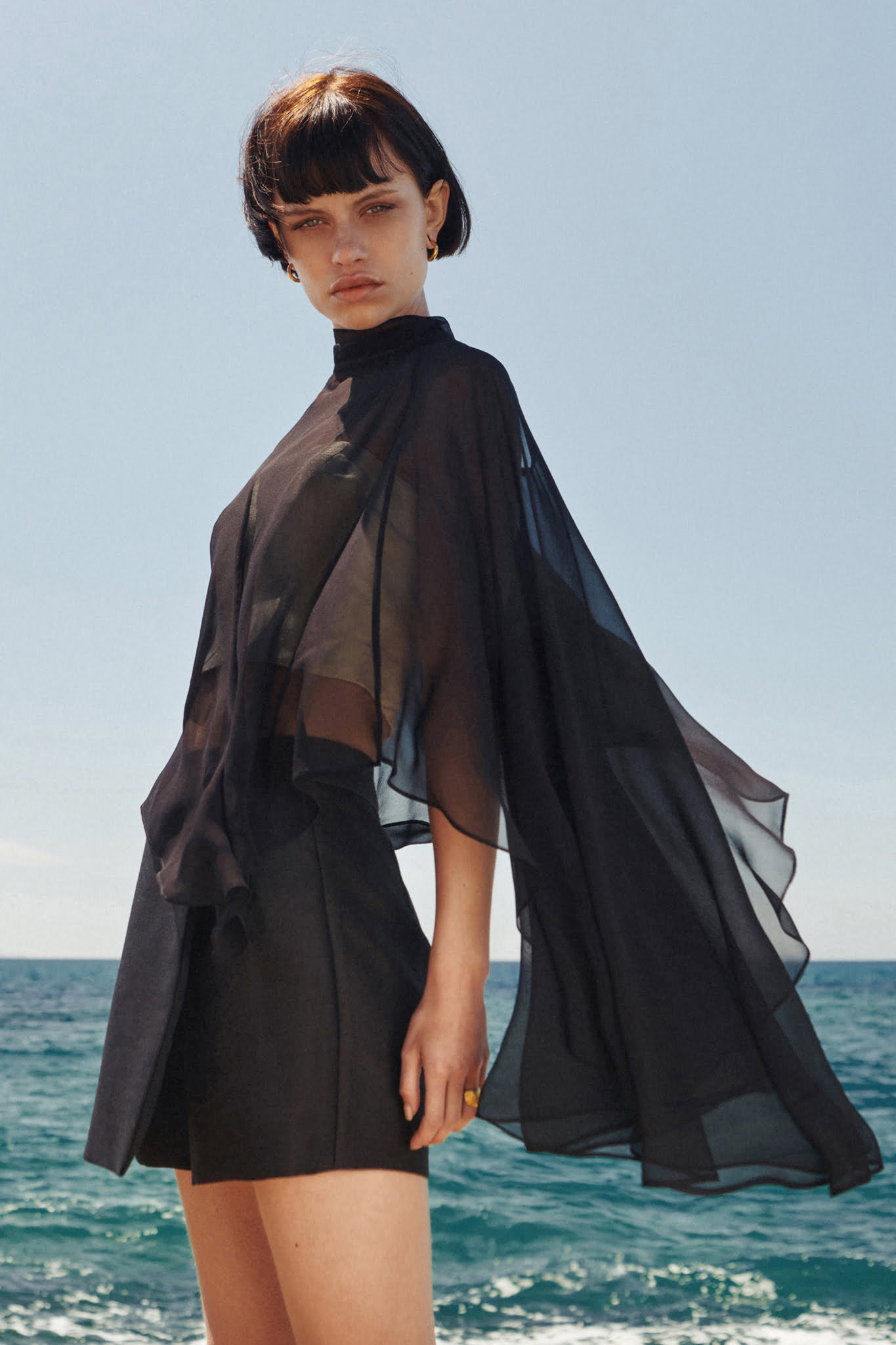 CREATE THE MOST ELEGANT EVENING OUTFIT BY ADDING OUR BLACK SHEER CAPE ON TOP OF A FITTED CORSET TOP TO ACHIVE A FEMININE AIRY LOOK