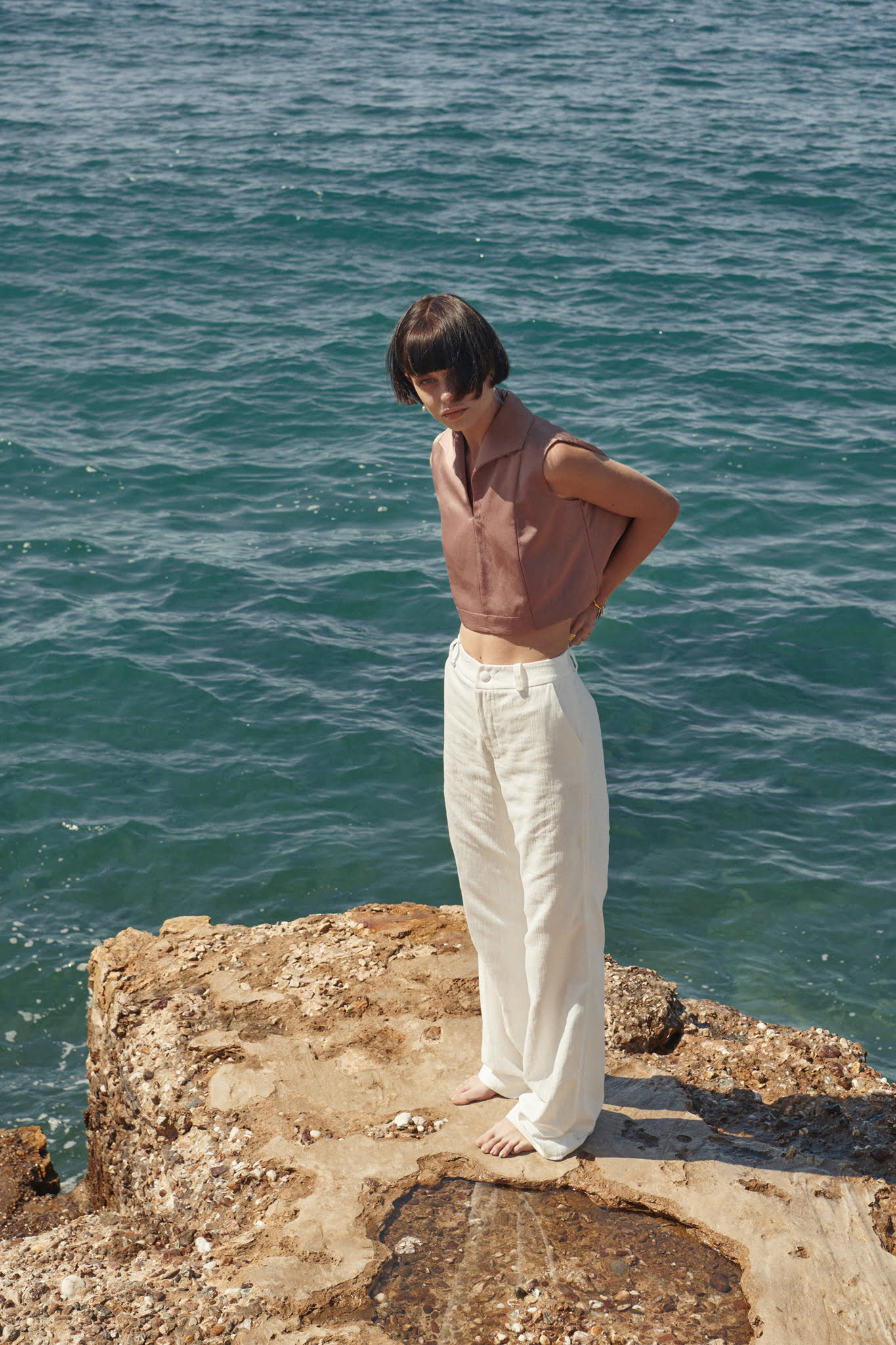 Inspired from the nautical world, this cropped top will give a very cool and feminine aesthetic to your look with its silky touch.